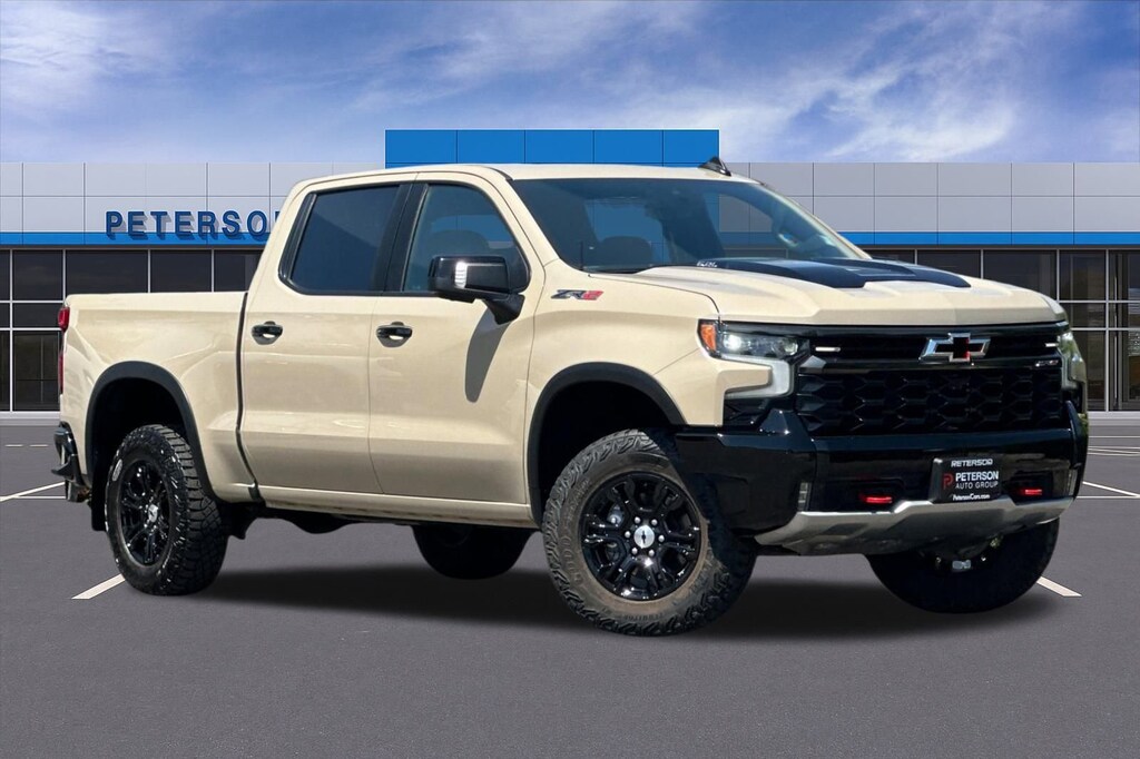 Our exclusive No Accidents Reported 2023 Chevrolet Silverado 1500 ZR2 Crew Cab 4X4 Short Bed with the Tech Pack is an exciting trail machine with extra capability in Sand Dune Metallic! Powered by a 6.2 Liter EcoTec3 V8 providing 420hp to a 10 Speed Automatic transmission. This Four Wheel Drive truck also features a unique ZR2 suspension with fully locking differentials and Multimatic DSSV dampers for great off-road confidence, and it scores nearly 19mpg on the highway. Muscular good looks are standard, featuring LED lighting, fog lamps, red recovery hooks, alloy wheels, robust skid plates, an EZ-Lift power lock/release tailgate, a sunroof, and a black bowtie on its aggressively impressive grille.