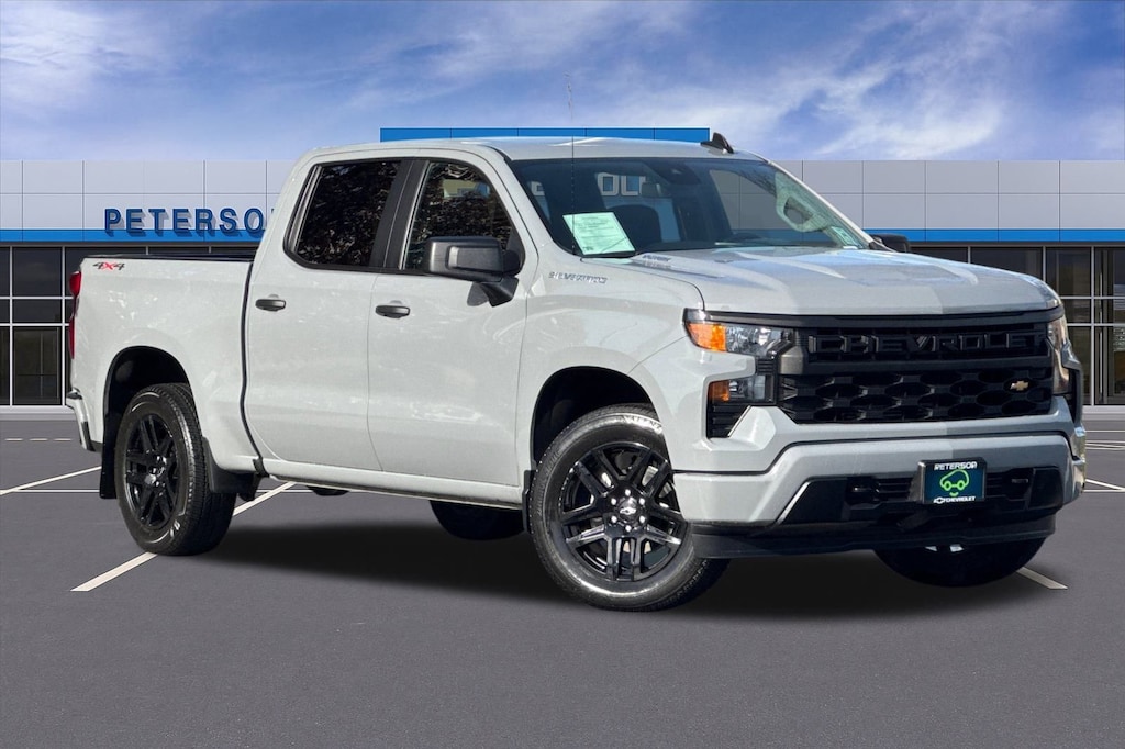 Car Bravo 12 month! See Dealer for Details! Recent Arrival! Odometer is 20144 miles below market average! Command every job site and weekend getaway with our One Owner, No Accidents Reported, Miles Below Market Average 2024 Chevrolet Silverado 1500 Custom Crew Cab 4X4 Short Bed in a sophisticated Slate Gray Metallic finish! Motivated by a 2.7L TurboMax supplying 310hp connected to an 8 Speed Automatic transmission with tow/haul mode. A high-capacity suspension further enhances capability, and this Four Wheel Drive truck returns nearly 22mpg on the highway. Our Silverado's rugged good looks help you get noticed with a powerful grille, LED lighting, bed lighting, 20-inch alloy wheels, black recovery hooks, a CornerStep rear bumper, an EZ-Lift power lock/release tailgate, heated power mirrors, and a trailer hitch.
