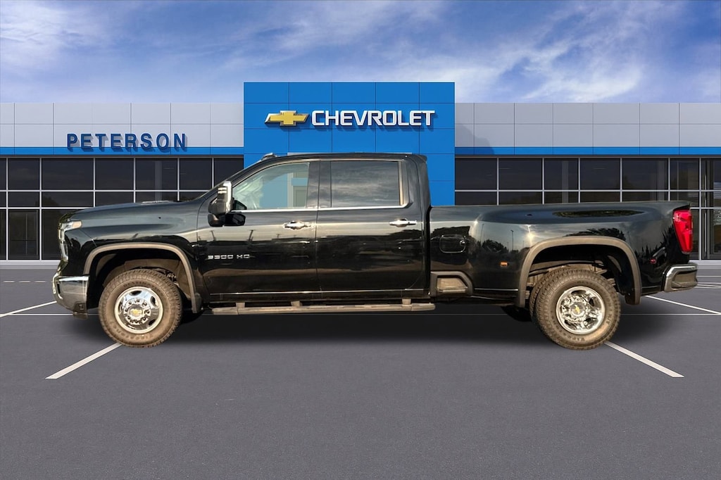 Our No Accidents Reported, Diesel powered Black 2024 Chevrolet Silverado 3500 LTZ Crew Cab Long Box Dually 4X4 is where capability meets comfort! A TurboCharged 6.6 Liter DuraMax Diesel V8 providing 470hp and 975lb-ft of torque to a 10 Speed Allison Automatic transmission that's here for hard work. Towing and hauling are a breeze with this Four Wheel Drive truck, which features Digital Variable Steering for confident command of the miles ahead. Clock in with style from our Silverado's bold grille, LED lighting, fog lamps, stainless steel beltline moldings, power trailer mirrors, chrome bumpers, matching accents, running boards, spray-on Bedliner, and alloy wheels.
