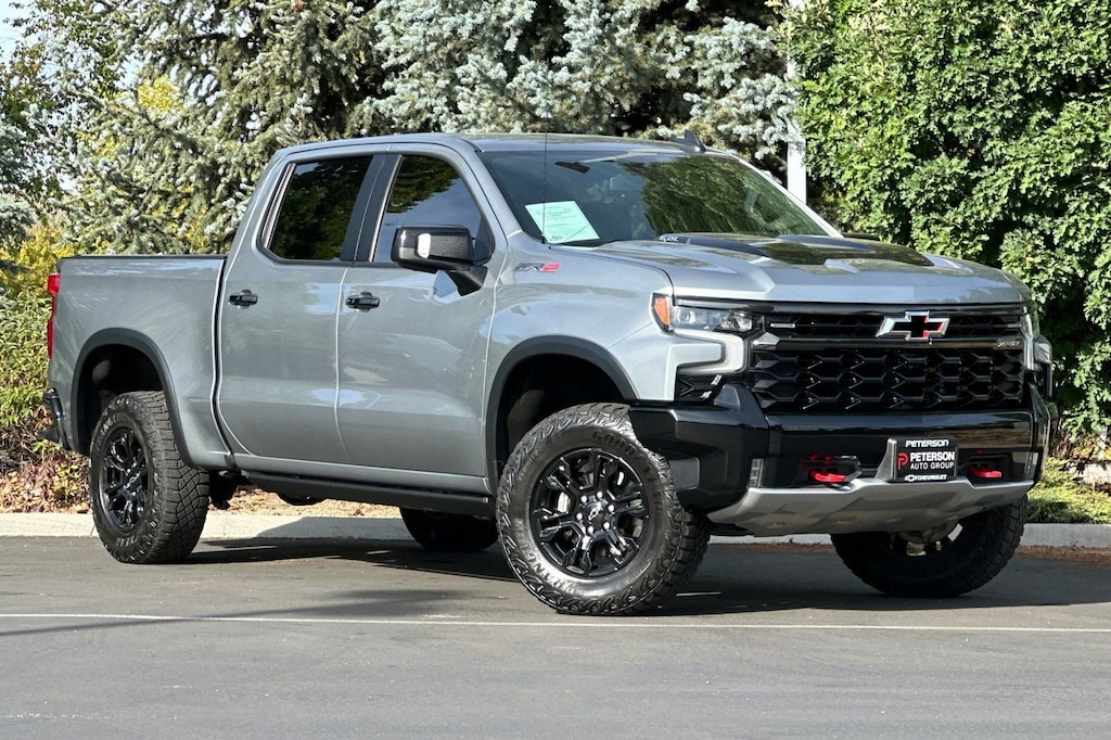 Recent Arrival! Our One Owner, No Accidents Reported 2023 Chevrolet Silverado 1500 ZR2 Crew Cab 4X4 Short Bed is an exciting trail machine with extra capability in Sterling Gray Metallic! Powered by a 6.2 Liter EcoTec3 V8 providing 420hp to a 10 Speed Automatic transmission. This Four Wheel Drive truck also features a unique ZR2 suspension with fully locking differentials and Multimatic DSSV dampers for great off-road confidence, and it scores nearly 19mpg on the highway. Muscular good looks are standard with LED lighting, fog lamps, red recovery hooks, alloy wheels, robust skid plates, an EZ Lift power lock/release tailgate, and a black bowtie on its aggressively impressive grille.