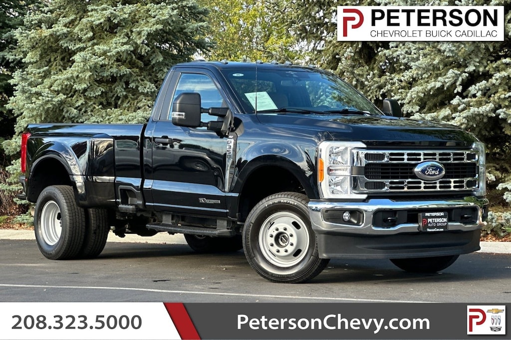Our No Accidents Reported, Diesel-powered 2023 Ford F-350 XLT Regular Cab 4X4 Dually in Agate Black Metallic is the tool of choice for smart owners like you! Motivated by a TurboCharged 6.7 Liter PowerStroke Diesel V8 offering 475hp and 1050lb-ft of torque to a 10 Speed Automatic transmission. This Four Wheel Drive truck can also reach job sites on the road or off, thanks to multiple performance modes, and it stands proud with bold styling. A bright chrome grille leads the way for F-350 style, featuring chrome bumpers, fog lamps, heated power trailer mirrors, alloy wheels, a tailgate step, front wheel well liners, tow hooks, spray-on Bedliner, a hitch receiver, and a power-locking tailgate.