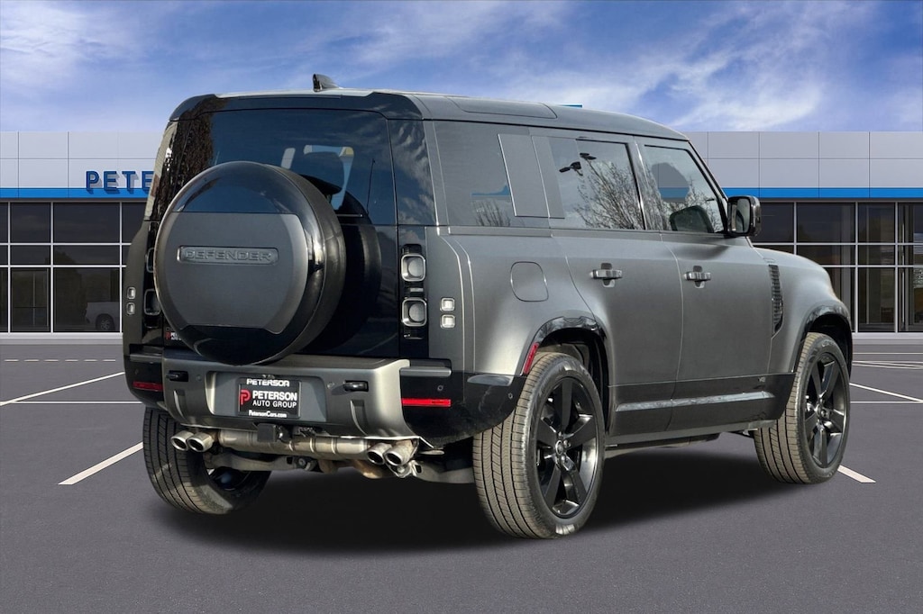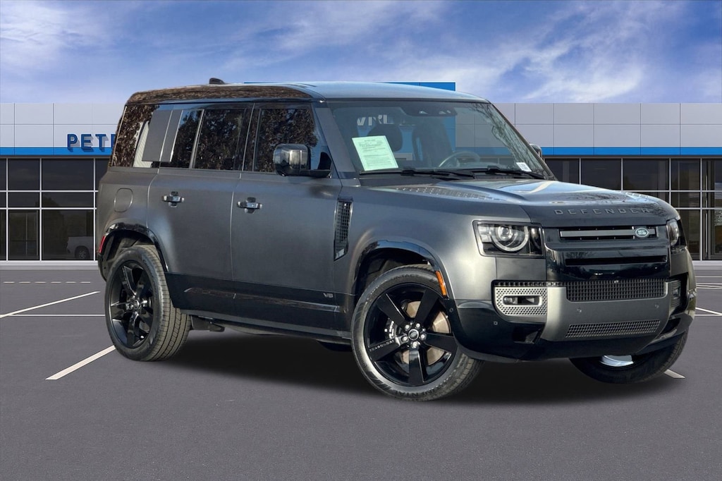 Recent Arrival! Our One Owner, Gray Metallic, 2025 Land Rover Defender 110 4 Door V8 P525 4WD can tackle even the harshest terrain as you relax in remarkable comfort. Powered by a SuperCharged 5.0 Liter V8 rewarding you with 518hp paired with an 8 Speed Automatic transmission for sensational performance. Designed to go through nature's finest vistas, this Four Wheel Drive SUV comes with an adaptive air suspension for off-road dominance, and it can attain nearly 19mpg on the highway. With eye-catching styling that looks incredible whether covered in mud or glistening with a fresh coat of wax, our Land Rover stands out with LED lighting, Shadow Atlas accents, and distinctive alloy wheels.