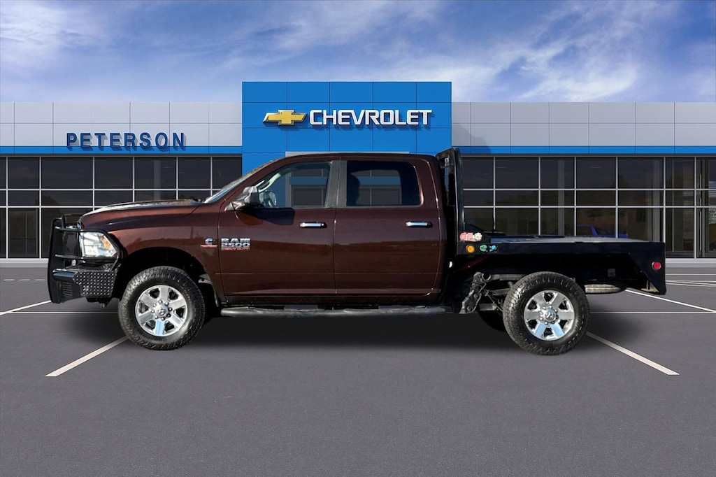 Recent Arrival! Our Diesel-powered Brown 2014 RAM 2500 SLT Crew Cab 4X4 Flat Bed looks sharp in. Fueled by a TurboCharged 6.7 Liter Cummins Diesel 6 Cylinder offering 350hp tethered to a 6 Speed Automatic transmission, can handle 800-foot pounds of torque. This Four Wheel Drive truck offers exceptional towing capability, great-looking wheels, fog lamps, chrome bumpers, and heavy-duty suspension. Enjoy the removable tailgate, power-heated folding side mirrors, step bars, and Custom front bumper w/grille guard setting for one tough working machine.