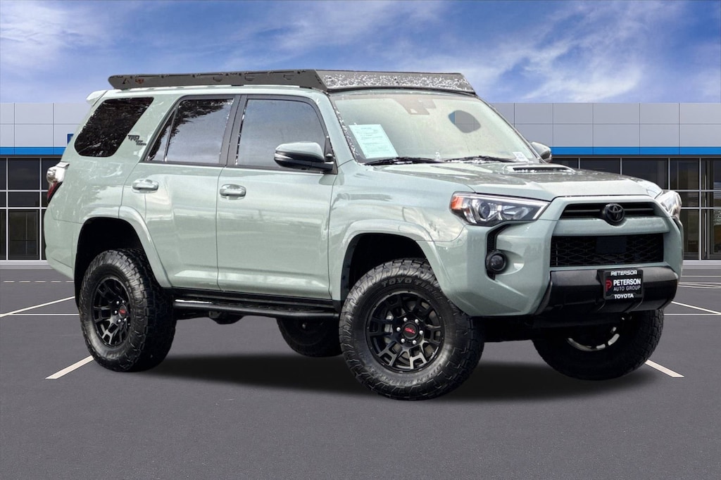 Recent Arrival! Odometer is 7265 miles below market average! Sporty, stylish, and ready for any family adventure, our One Owner, No Accidents Reported, Miles Below Market Average 2023 Toyota 4Runner TRD Off-Road Premium 4WD stands out in a commanding Lunar Rock design! Motivated by a 4.0 Liter V6 that delivers 270hp connected to a 5 Speed Automatic transmission. You can take advantage of a locking rear differential, crawl control, and Multi-Terrain Select to leave the road behind, and this Four Wheel Drive SUV also sees nearly 19mpg on the highway. Our 4Runner's aggressive style gets a boost from LED lighting, fog lamps, a protective skid plate, black-accented alloy wheels, roof rails, front/rear mudguards, a power liftgate, a power sunroof, a rear power window, and heated power mirrors with built-in turn signals.